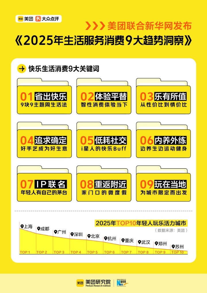 1月21日,新华网联接好意思团商讨院发布《2025生计就业浮滥趋势知悉》。2025年,好意思团APP上与情愿生计磋议的就业浮滥订单量同比增长36%,95后浮滥者占比近6成,上海、成齐、广州、深圳、北京、杭州、重庆、武汉、郑州、苏州位列TOP10年青东谈主玩乐活力之城。据诠释注解,2025生计就业浮滥九简短道词为:省出情愿、体验平替、乐有所值、追求详情、低耗交接、内养外练、IP联名、重返隔壁、玩在当地,提供新奇感、开释压力、彰显气派的“情价比”浮滥悄然崛起。