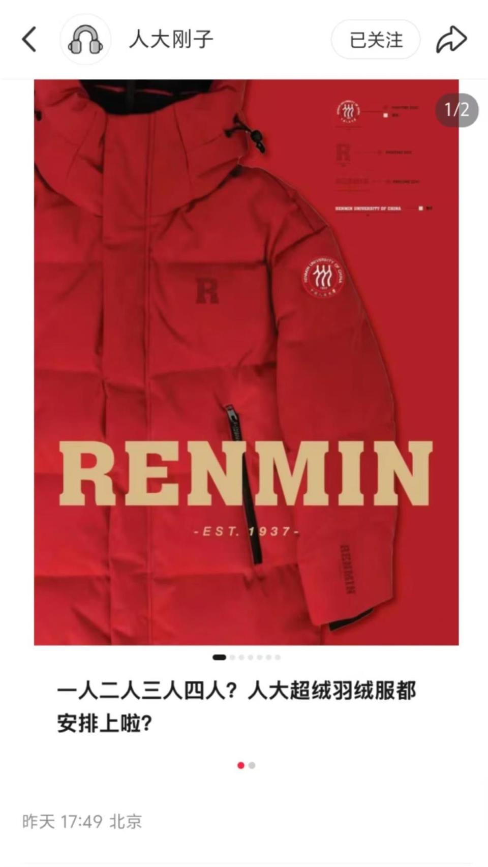 据中国东谈主民大学党委秘书张东刚使用“东谈主大刚子”账号发帖,本色为两张图,第一张为学校红色超绒羽绒服的宣传图,第二张为该羽绒服的居品及购买信息图:显然列出了长款、短款、儿童款三种单品,以及“二东谈主天下”“三口之家”“四口之家”的组合套餐;同期标注了东谈主大红创文化大厦店、崇德店、汇贤店三个线下门店地址。此帖发出后,不少网友在驳斥区留言求购,“秘书能送我一件羽绒服吗”“能在驳斥区抽个奖送我一件吗”。
