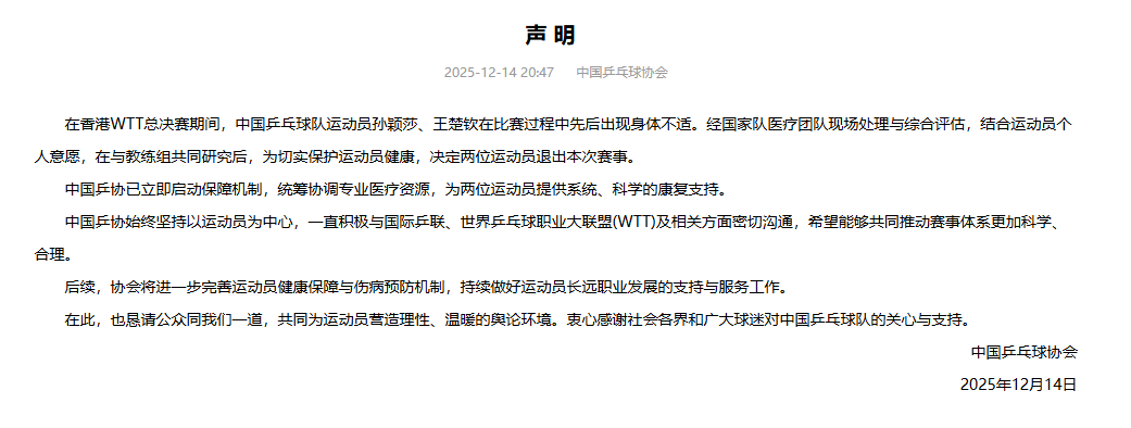 中国乒乓球协会14日晚在其官网发布声明,对国乒队员孙颖莎、王楚钦辞世界乒乓球作事大定约(WTT)香港总决赛时刻因体魄不适退赛作出复兴,文中称:“在香港WTT总决赛时刻,中国乒乓球队通顺员孙颖莎、王楚钦在比赛历程中先后出现体魄不适。经国度队医疗团队现场惩处与概括评估,网络通顺员个东谈想法愿,在与教育组共同揣摸后,为切实保护通顺员健康,决定两位通顺员退出本次赛事。中国乒协已立即运行保险机制,统筹配合专科医疗资源,为两位通顺员提供系统、科学的康复复旧。”