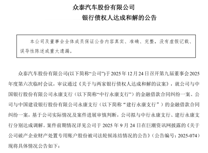 12月24日天元证券官网-在线配资开户_线上股票配资开户,众泰汽车发布公告称,已与中国银行永康支行、建树银行永康支行区分达成债务妥协公约。这次,波及妥协的总金额为4.05亿元。字据公约,众泰汽车需在2025年12月31日前向两家银行各支付1000万元本金,余款需在2026年1月31日前一谈反璧。据了解,众泰汽车与两大银行的纠纷主淌若源于历史金融借债合同争议。