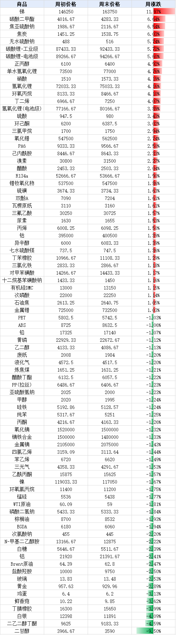 据买卖社价钱监测,2025年第46周(11.17-11.21)巨额商品价钱涨跌榜中环比飞腾的商品共78种,汇集在化工板块(共50种)和有色板块(共11种),涨幅在5%以上的商品主要汇集在化工板块;涨幅前3的商品永别为锑(11.97%)、碳酸二甲酯(6.64%)、焦亚硫酸钠(6.54%)。